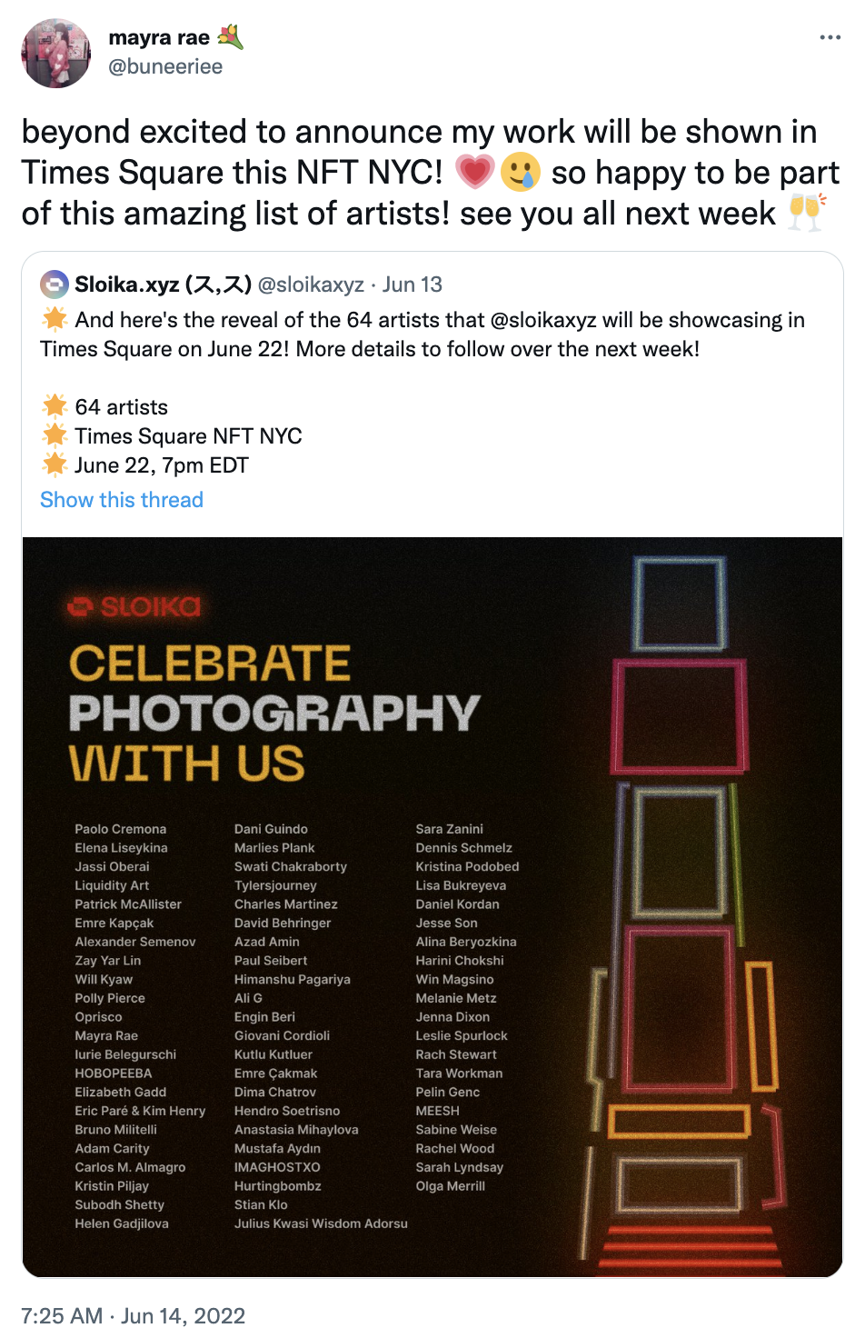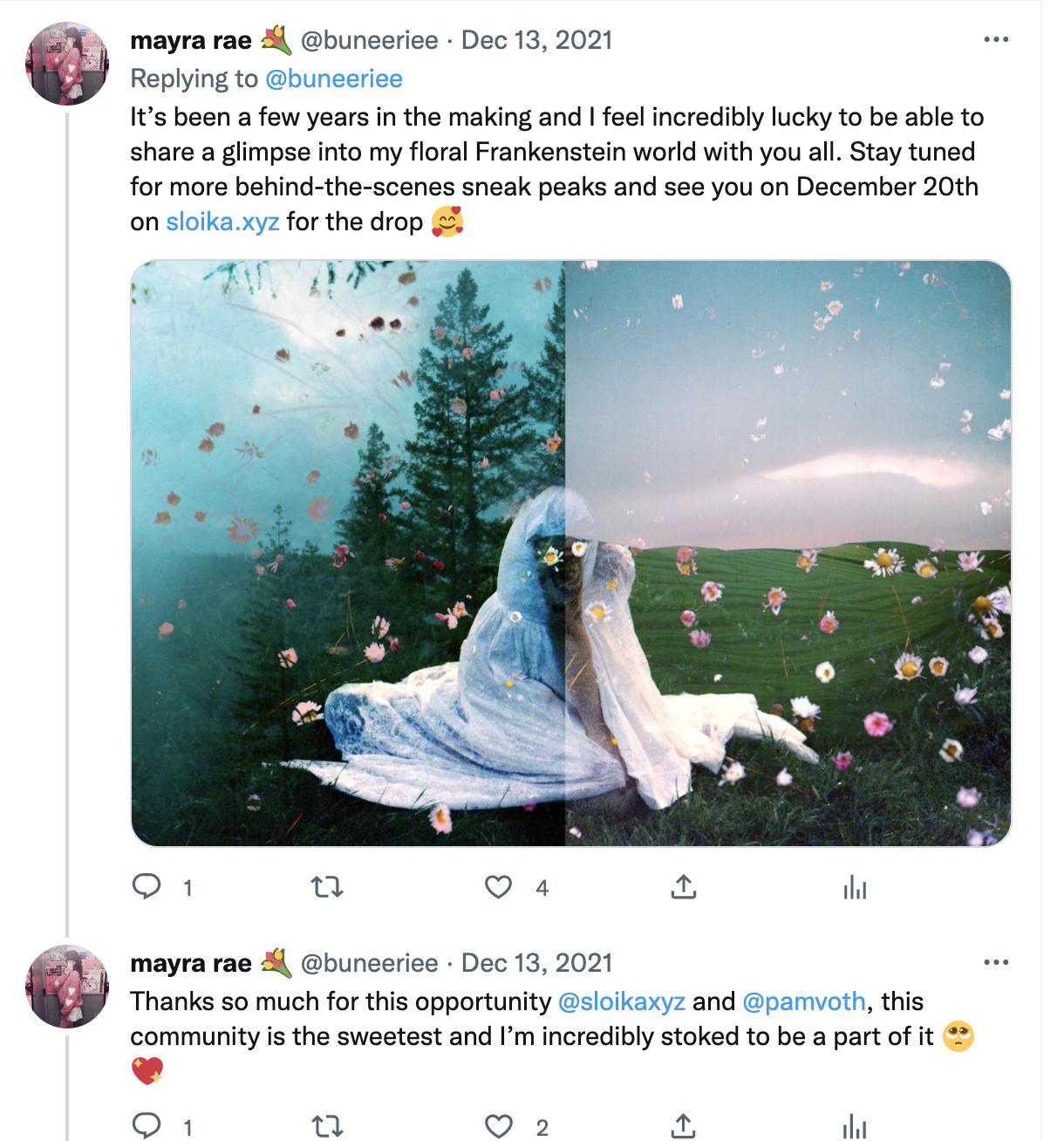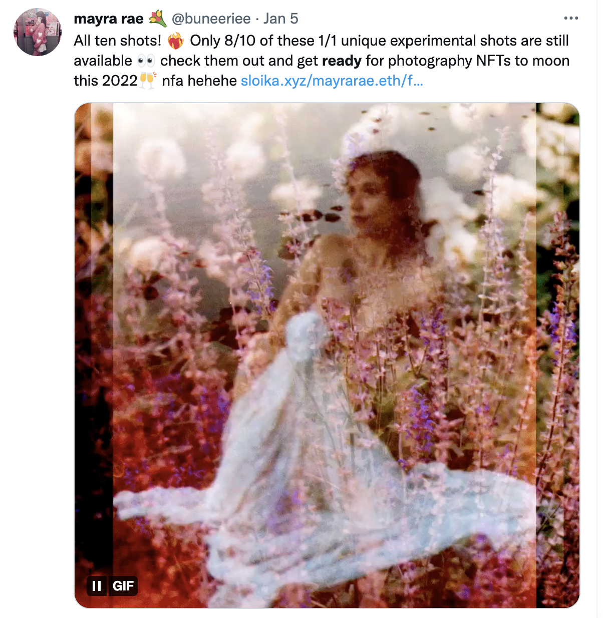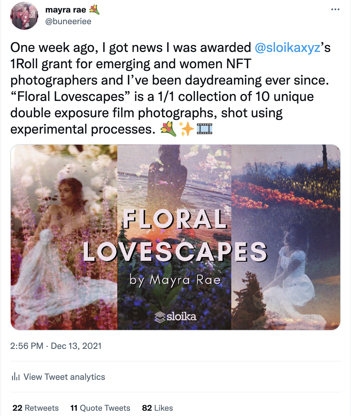 After a few months of sharing my art online, connecting with artists in the NFT space, and with only 200 followers, I applied for an art grant hosted by Sloika.xyz - a photography only NFT platform that was recommended to me by a fellow crypto friend in my months of lurking the space. In December 2021, I was awarded Sloika’s 1Roll grant - jumpstarting my NFT journey.