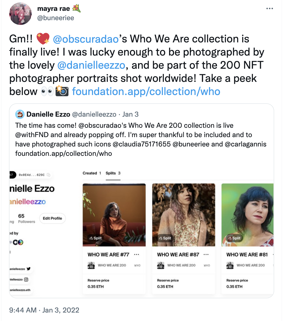 By February, I had sold out half of my collection - worth about 2.5 eth at the time. With Twitter, it’s important to say consistent and keep sharing and connecting to as many people as possible. Whether it’s in the DMs, a group chat, or replying to their tweets. I met so many wonderful people and collectors this way - creating a real friendships with likeminded folk through the blue light of a screen.