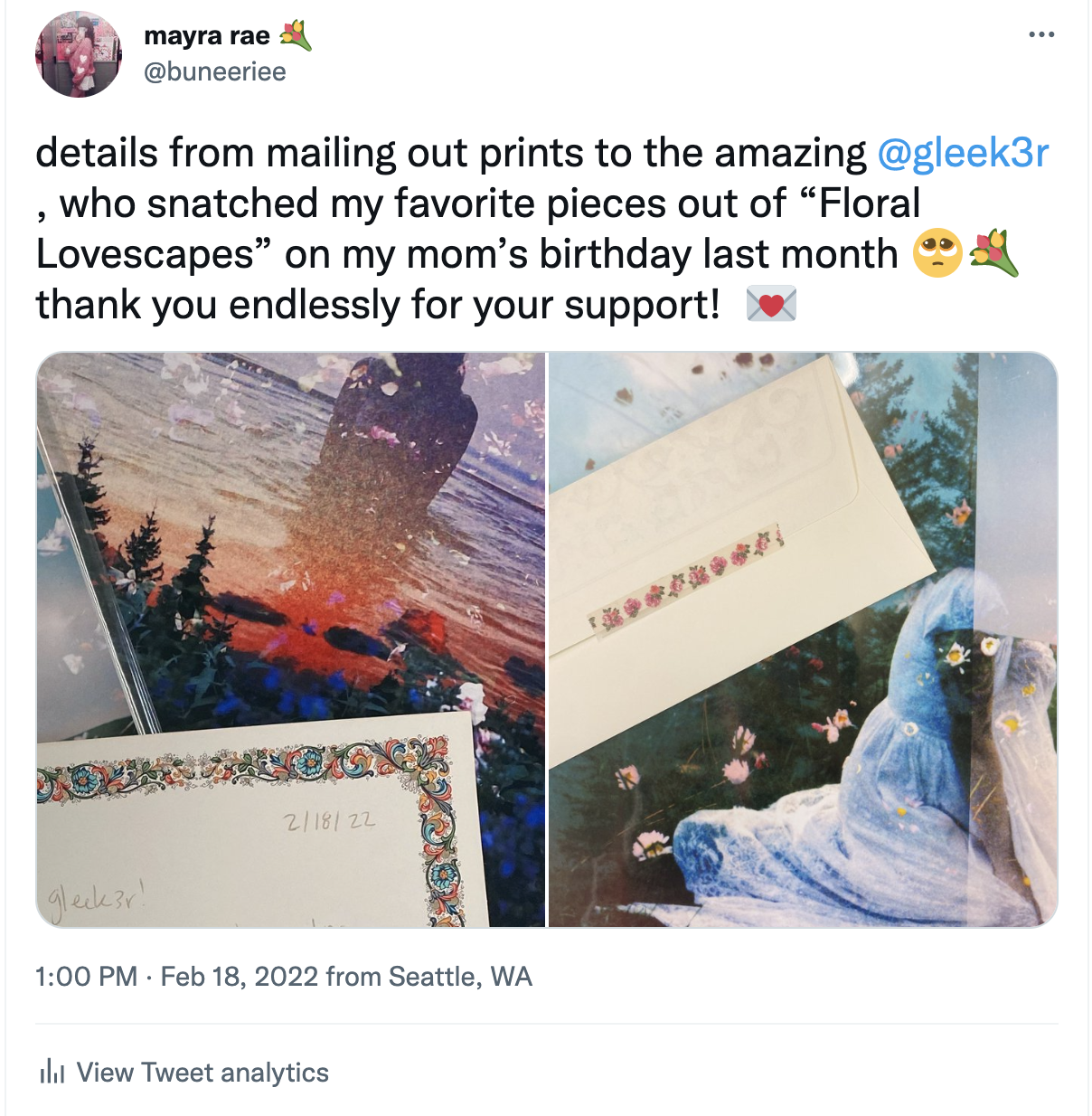 Slowly at first, I started gaining new followers and had my first two sales. As a perk, I personally printed and mailed a physical copy of their NFT to my first collector - the founder of Sloika. I think reaching out physically to those we meet online is incredibly important to bridge the gap that online spheres can sometimes create. Mailing letters and prints to my collectors allowed me to create stronger friendships and connections to those I met in the internet sphere.